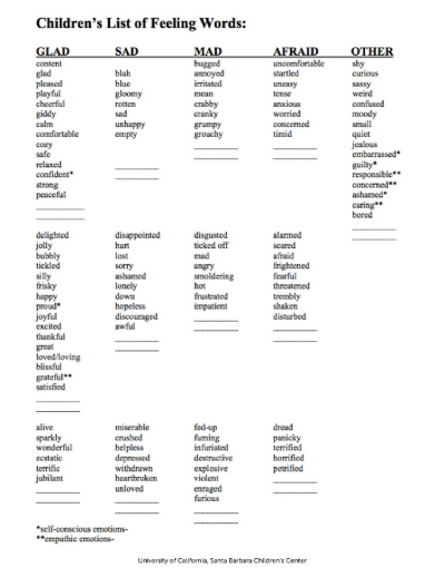 To begin this exercise, give each student a list of feeling words. You can create your own list, or use the sample list below which was created by the UCSB Children’s Center.